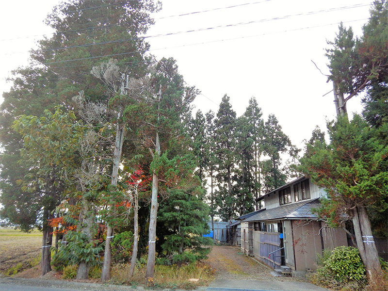 入口周辺の樹高6m、胸高直径30cmの木が2本を根切伐採し、枝切伐採も実施しました。